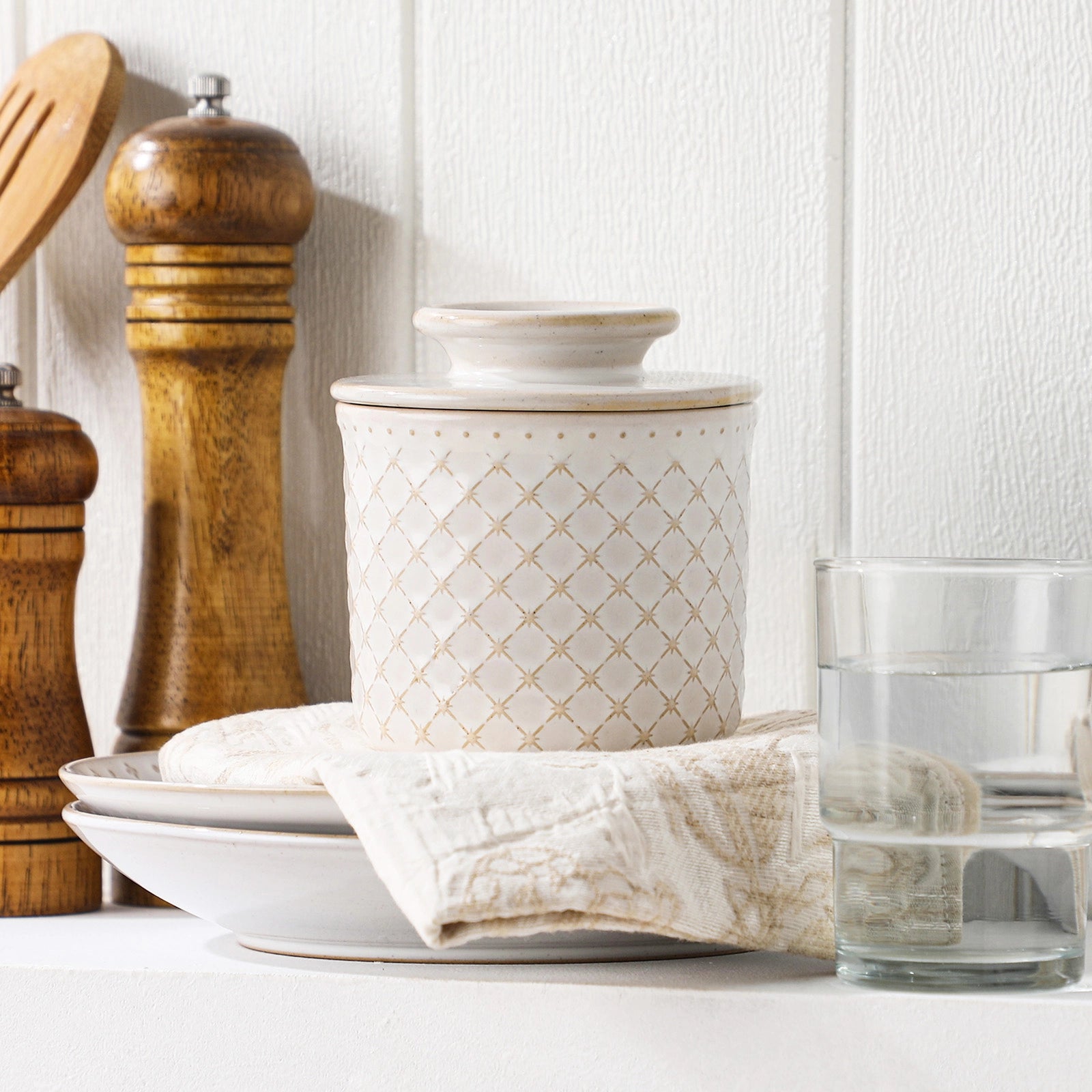 Crafted from durable lead-free ceramic, this butter crock features a smooth glazed finish, a unique speckled look, and an embossed vintage-inspired design. Ideal for daily use, it holds up to 1.5 sticks of butter and brings both beauty and convenience to the countertop.