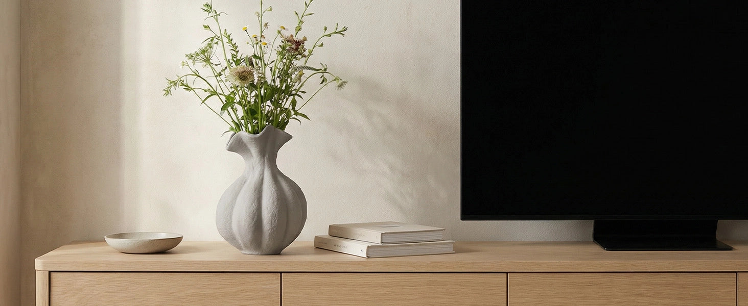 • The soft gray finish and handcrafted texture bring depth, calm, and understated elegance to shelves and tabletops.